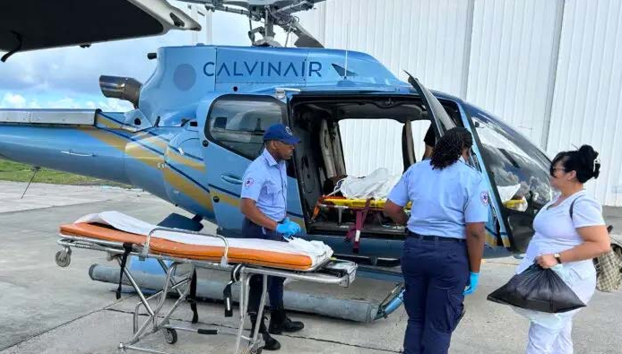 The patient presented at the Hanna Thomas Hospital with severe neck and head pain and was unable to walk, prompting doctors to request an immediate transfer to the mainland for a CAT scan. Within minutes of the request, a CalvinAir helicopter was dispatched, ensuring the patient received timely access to specialized diagnostic care at the Sir Lester Bird Medical Centre.